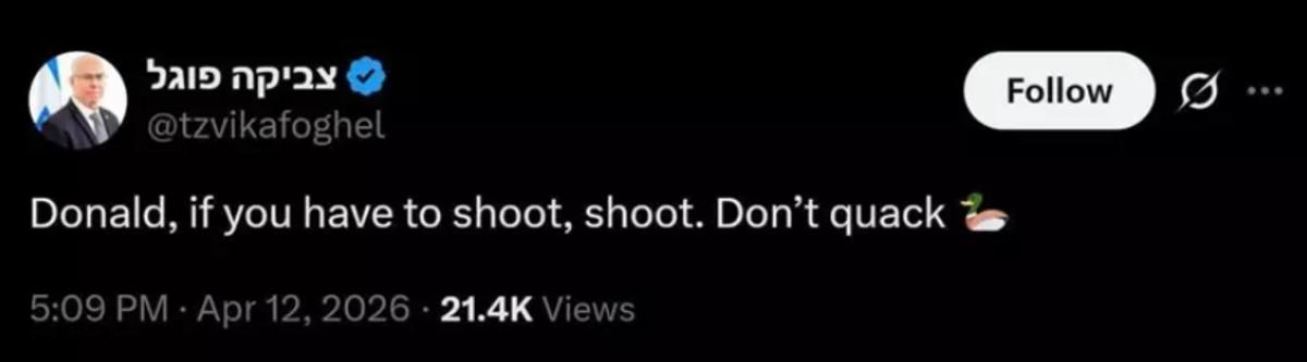 <meta name="description" content="İsrail Meclisi Ulusal Güvenlik Komitesi Başkanı Zvika Vogel, ABD Başkanı Trump'ın İran'a yönelik tehditlerini alaya alarak sert bir mesaj verdi. Vogel, paylaşımına alaycı bir ördek emojisi de ekledi." />