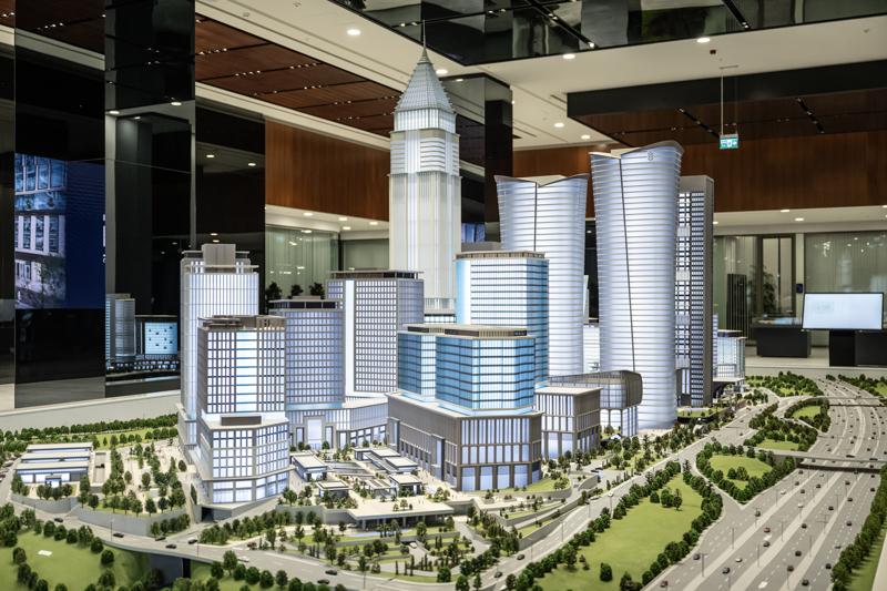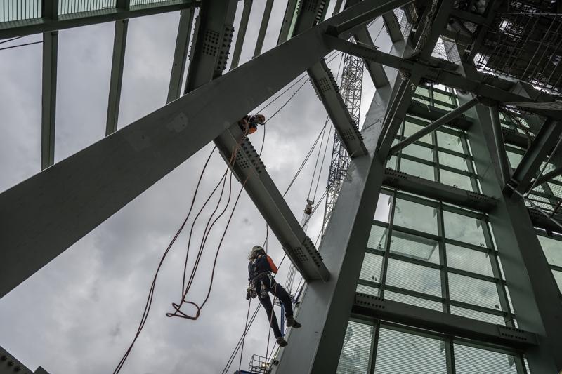 "327 bin metrekare inşaat alanına sahip ve akıllı teknolojilerle inşa edilmiş bir bina. Üst cihannümada cephe çalışmalarımız devam ediyor. Panellerle gelip burada cam montajlarını yapıyoruz. Türkiye deprem şartnamesinde öngörülen en yüksek deprem hareketlerine göre tasarlanmış ve imalatı yapılmış bir bina. Bugün devam eden üst cihannümada dağcılarımızın cephe çalışmalarını yapıyor. Bunun haricinde binamızda cephe sistemleri, doğal havalandırma sistemleri, özel olarak tasarlandı."