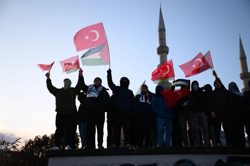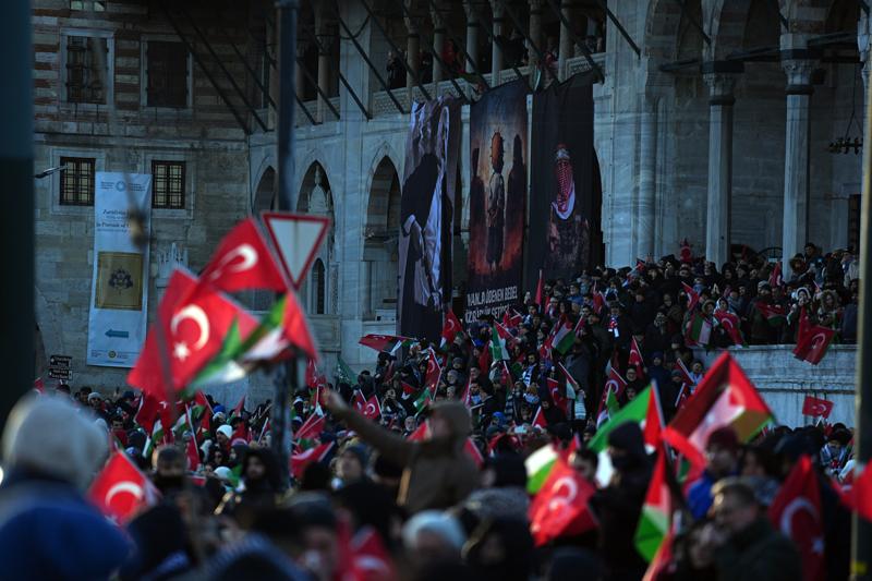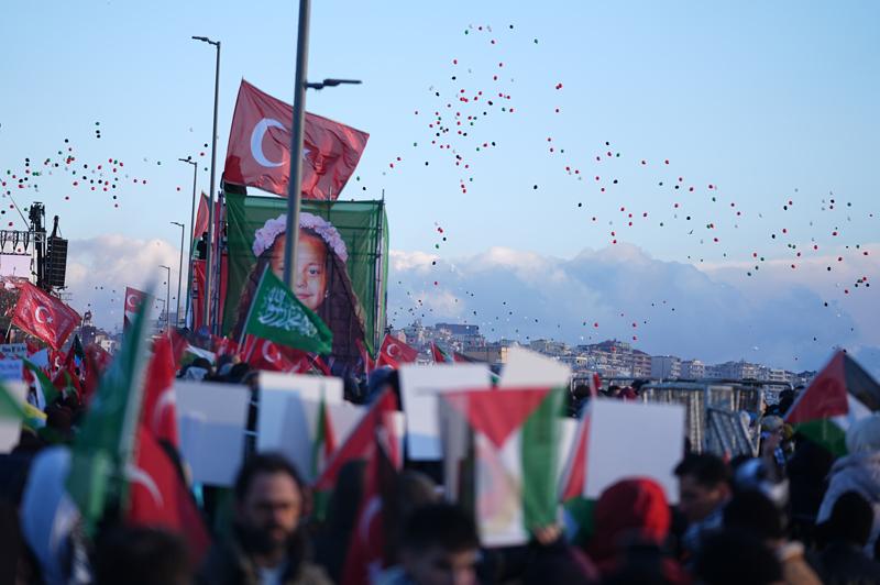 Türkiye Gençlik Vakfı (TÜGVA) öncülüğünde, İnsanlık İttifakı ve Milli İrade Platformu çatısı altında "Sinmiyoruz, susmuyoruz, Filistin'i unutmuyoruz" sloganıyla düzenlenen eylem için Ayasofya-i Kebir Cami-i Şerifi, Sultanahmet Camisi ve Eminönü'ndeki Yeni Cami ile Fatih ve Süleymaniye camilerinin önünde toplanan insanlar, sloganlar ve tekbirler eşliğinde Galata Köprüsü'nde buluştu.