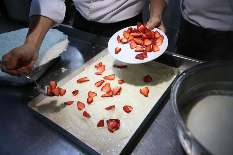 Güllaç yapımının hazırlığına sütü şekerle kaynatarak başladıklarını ifade eden İçer, "Süt kaynadıktan sonra güllaç yapraklarımızı içerisine bandırarak baklava tepsimize alıyoruz. Birkaç kat böyle devam ediyoruz. Ondan sonra içerisinde zevkimize göre ceviz, fındık, çilek koyabiliyoruz. Daha sonrasında tekrardan üstüne birkaç kat güllaç yapraklarımızı koyuyoruz ve üstteki süslemesiyle güllacımızı sonlandırıyoruz." dedi.