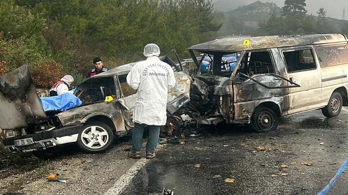 İzmir'in Menderes ilçesinde minibüs ile çarpışan otomobilin alev aldığı kazada sürücü hayatını kaybetti, 3 kişi yaralandı.