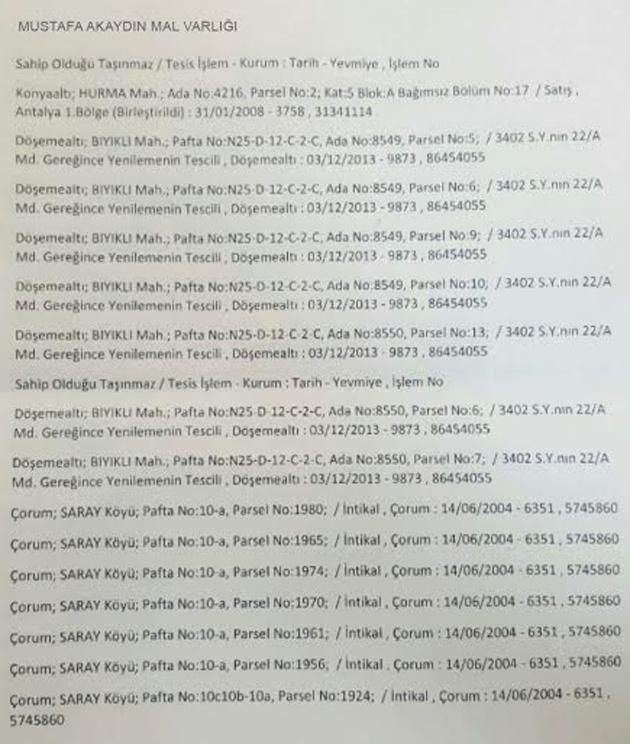<meta name="description" content="Sayıştay tarafından kamuyu zarara uğrattığı gerekçesi ile 2 milyon lira zimmet çıkarılan Mustafa Akaydın’ın emlak zengini olduğu ortaya çıktı. Kararın ortaya çıkmasının ardından yaptığı açıklamalarda kendisinin mal varlığı olmadığını sadece maaşı olduğunu dile getiren Akaydın ve eşinin Antalya Döşmeaaltı’nda villa ve çiftlik, Konyaaltı’nda 2 daire, Muratpaşa’da 1 daire, Çankaya’da bir daire, Döşemealtı’nda çok sayıda arsa ve Çorum Saray Köyü’nde 7 ayrı arsası bulunuyor." />