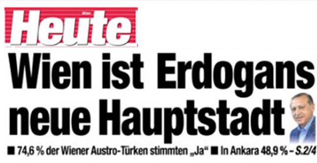 <meta name="description" content="Avusturya'da Heute gazetesi, başkent Viyana'da yüzde 74 evet çıkmasını 'Erdoğan'ın yeni başkenti Viyana' şeklinde manşetine taşıdı.    " />