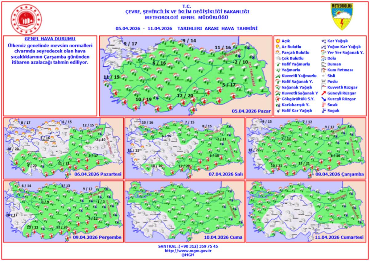 <meta name="description" content="Meteoroloji Genel Müdürlüğü son hava durumu tahminlerini paylaştı. Yapılan son değerlendirmelere göre bahar havası yerini soğuk ve yağışlı havaya bırakıyor. Ülke genelinde çok bulutlu ve yağışlı hava etkili olurken çarşamba günü itibarıyla sıcaklıklar sert düşecek; yurdun büyük bölümünde yağışlar etkili olurken, Doğu Anadolu bölgesi için çığ uyarısı yapıldı. " />