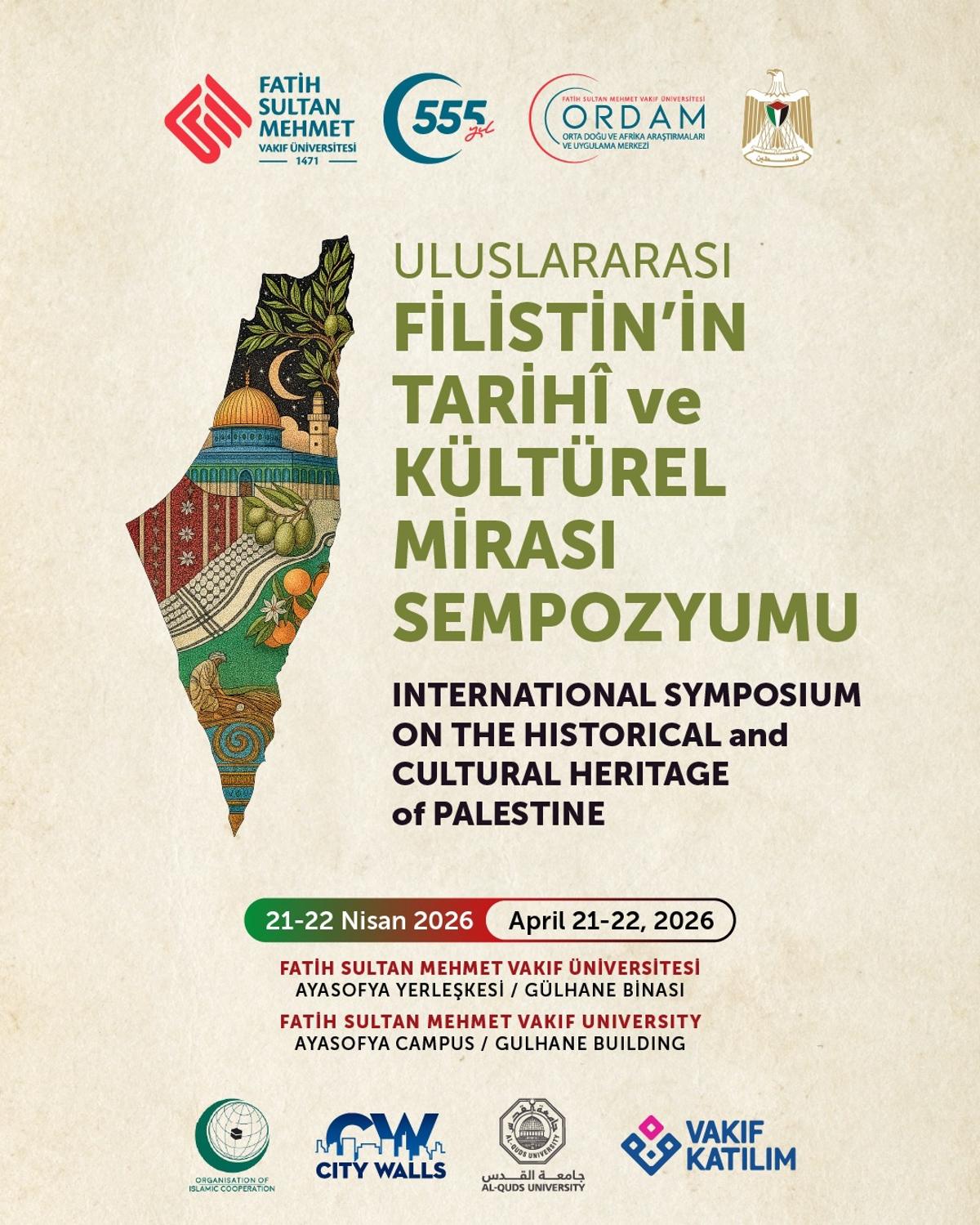 <meta name="description" content="Fatih Sultan Mehmet Vakıf Üniversitesi tarafından düzenlenen “Uluslararası Filistin'in Tarihî ve Kültürel Mirası Sempozyumu”, 21-22 Nisan 2026 tarihlerinde Ayasofya Yerleşkesi Gülhane Binası'nda gerçekleştirilecek." />